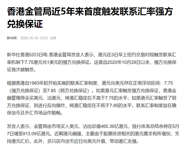 5月3日,香港还出现了惊人的一幕:由于国际资金迅猛流入香港,市场里用美元兑换港币的需求急升。为了维护汇率稳定,香港金管局单日抛售了超过465亿港元。