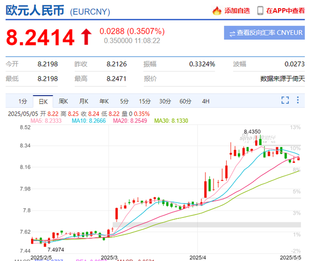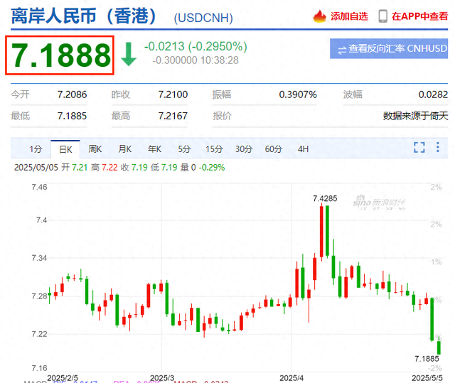 特朗普抛出对等关税后,人民币对美元汇率一度贬值到了7.4285,而目前为7.1888,不到1个月的时间里升值了近2400个基点。