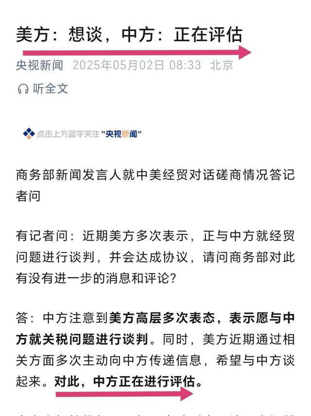 第一,“对此,中方正在进行评估”,有“可能谈”的意思。之前的表态,往往是辟谣,说“没有谈”。